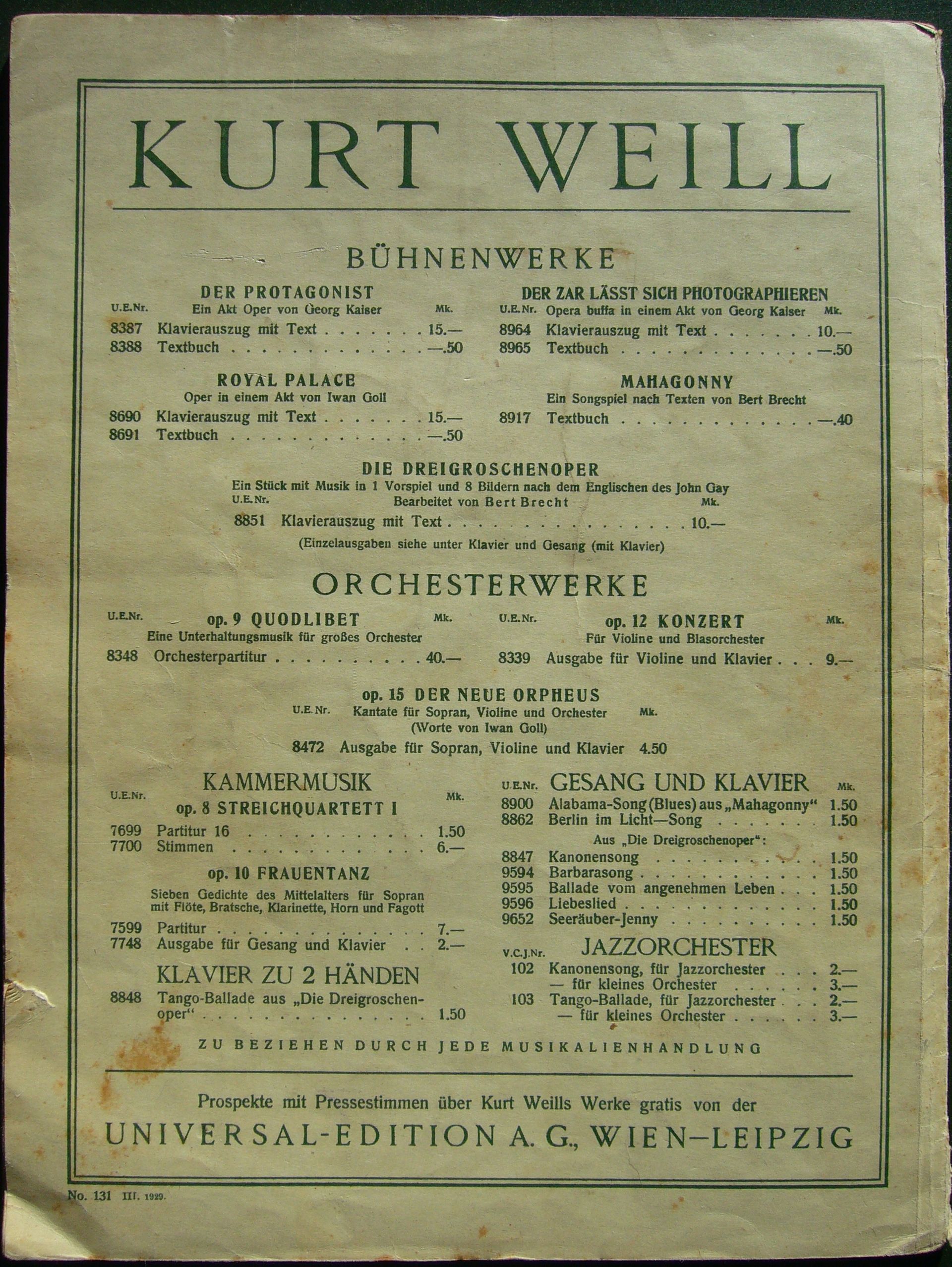 back cover: Light green paper. Recto blank. Verso a green double-lined border. Within the border advertising for other UE publications. For an exact presentation please check the photo below, the most important information is which works and editions are offered: "KURT WEILL / BÜHNENWERKE / DER PROTAGONIST [with UE 8387 and 8388] / DER ZAR LÄSST SICH PHOTOGRAPHIEREN [with UE 8964 and 8965] / ROYAL PALACE [with UE 8690 and 8691] / MAHAGONNY [with UE 8917] / DIE DREIGROSCHENOPER [with UE 8851] / ORCHESTERWERKE / op.9 QUODLIBET [with UE 8348] / op.12 KONZERT [with UE 8339] / KAMMERMUSIK / op.8 STREICHQUARTETT I [with UE 7699 and 7700] / KLAVIER ZU 2 HÄNDEN [with UE 8848] / op.10 FRAUENTANZ [with UE 7599 and 7748] / GESANG UND KLAVIER [with UE 8900, 8847 and 8862] / ZU BEZIEHEN DURCH JEDE MUSIKALIENHANDLUNG / Prospekte mit Pressestimmen über Kurt Weills Werke gratis von der / UNIVERSAL-EDITION A. G., WIEN-LEIPZIG". At the bottom left, outside the border "No. 131 X. 1928."