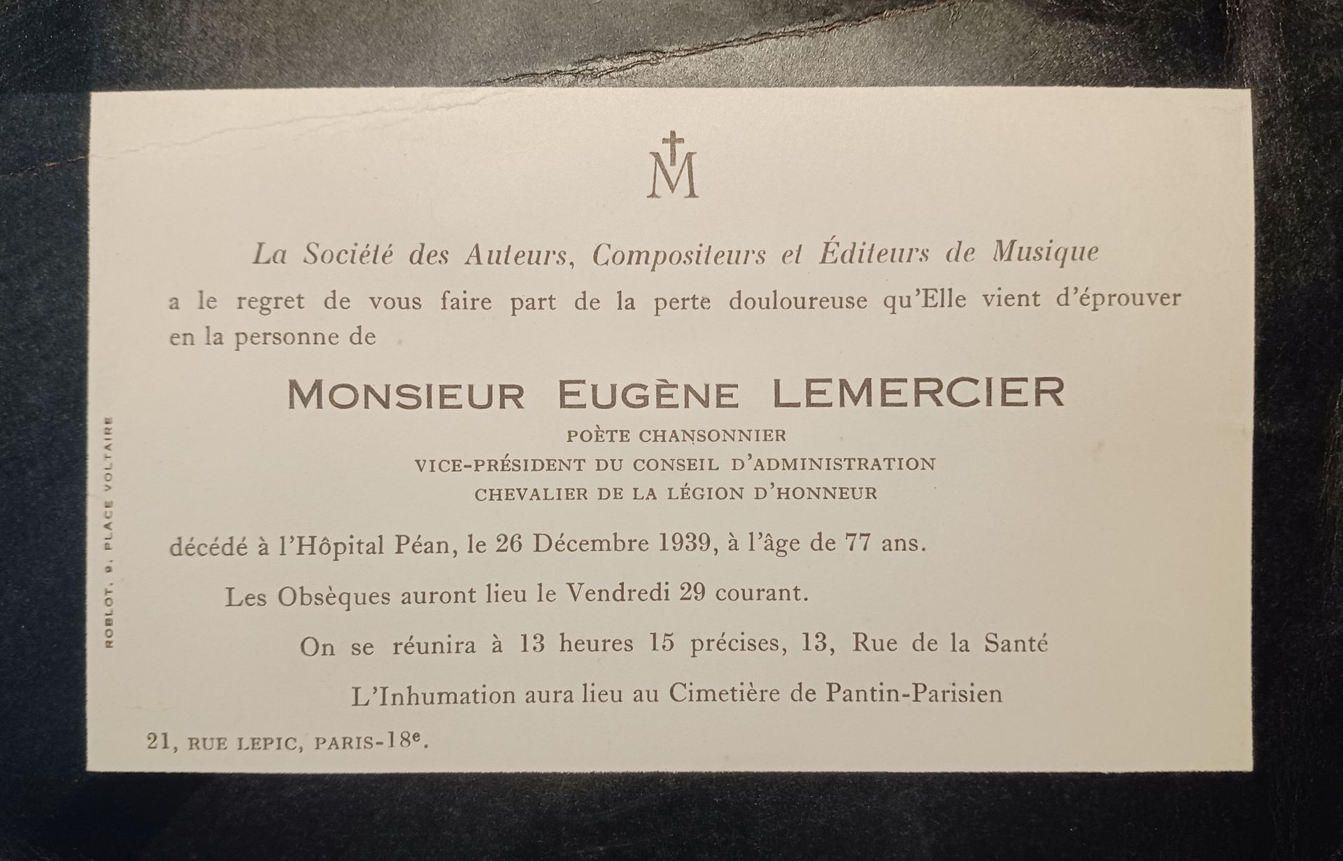 Eugene Lemercier died on 26 December 1939 in Paris (France).