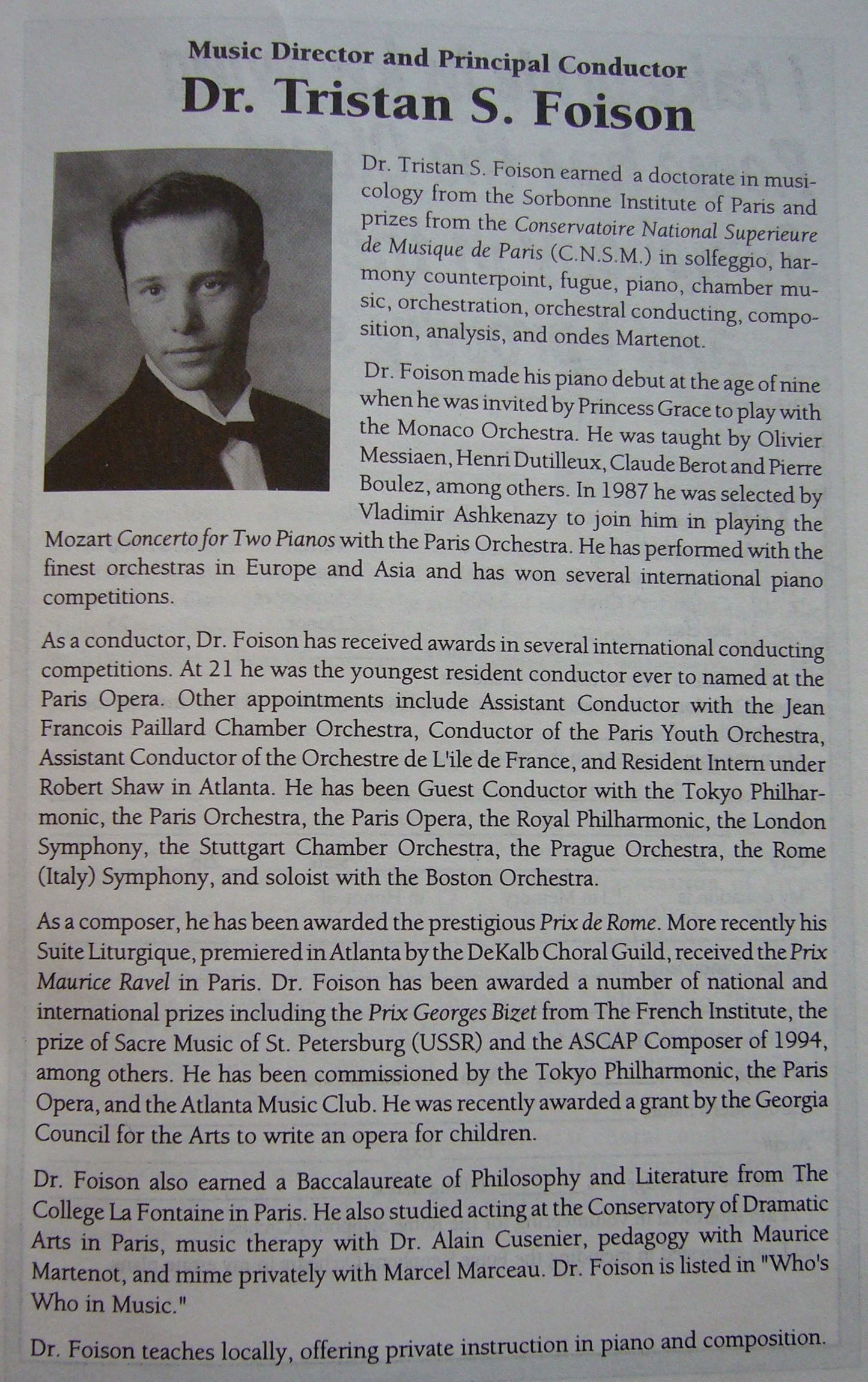 One of the main reasons for the success of Tristan Foison as a conductor was his remarkable CV. When in 2001 his career collapsed like a house of cards a journalist from the Atlanta Journal Constitution talked to the persons in charge at the Rome (Georgia) Symphony Orchestra where Tristan Foison was principal conductor from 1995 to 1998. The article published on 29 July 2001 contained this statement: