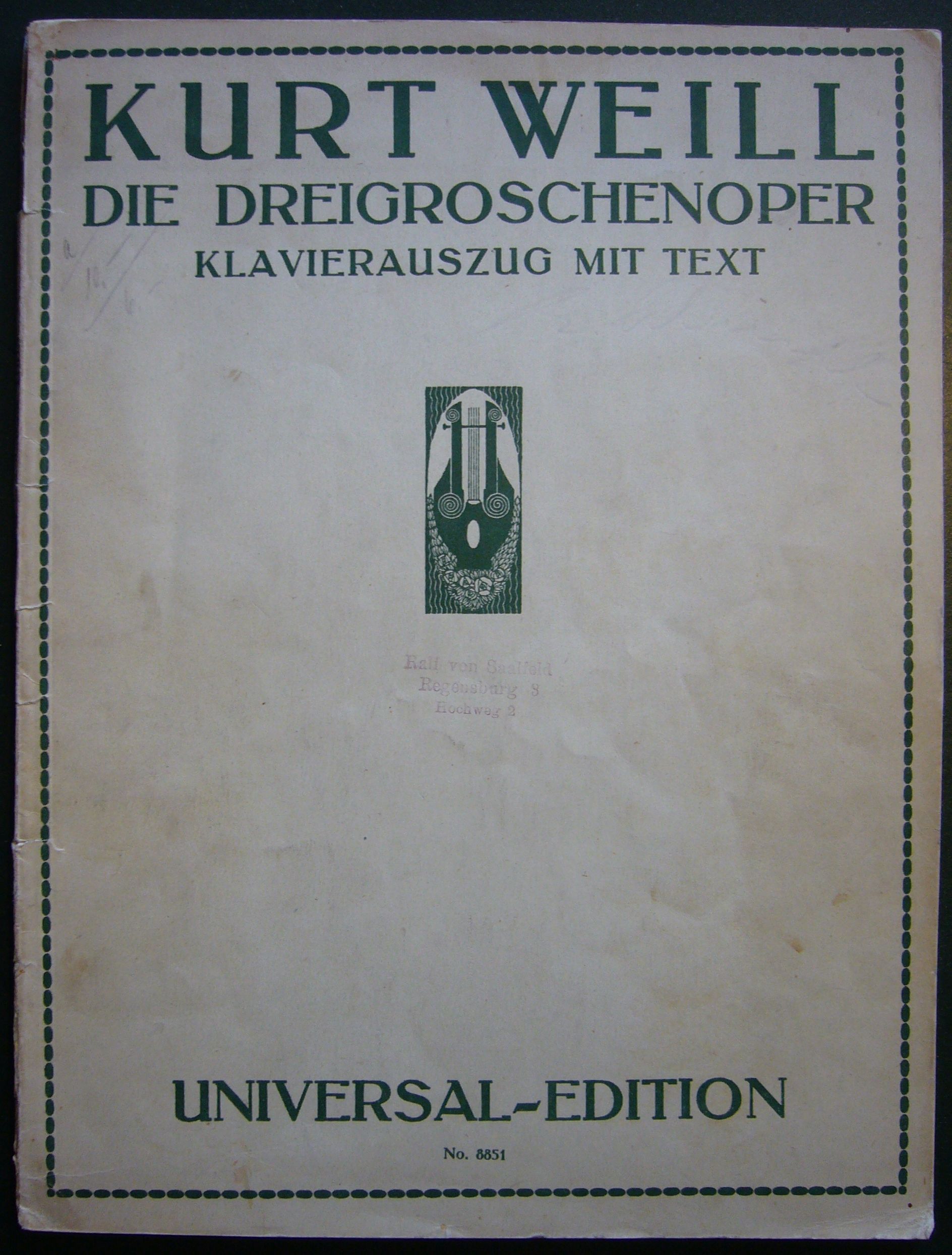 spine: White paper, in black letters, italic: "U. E. 8851, KURT WEILL, DIE DREIGROSCHENOPER, KLAVIERAUSZUG MIT TEXT"
