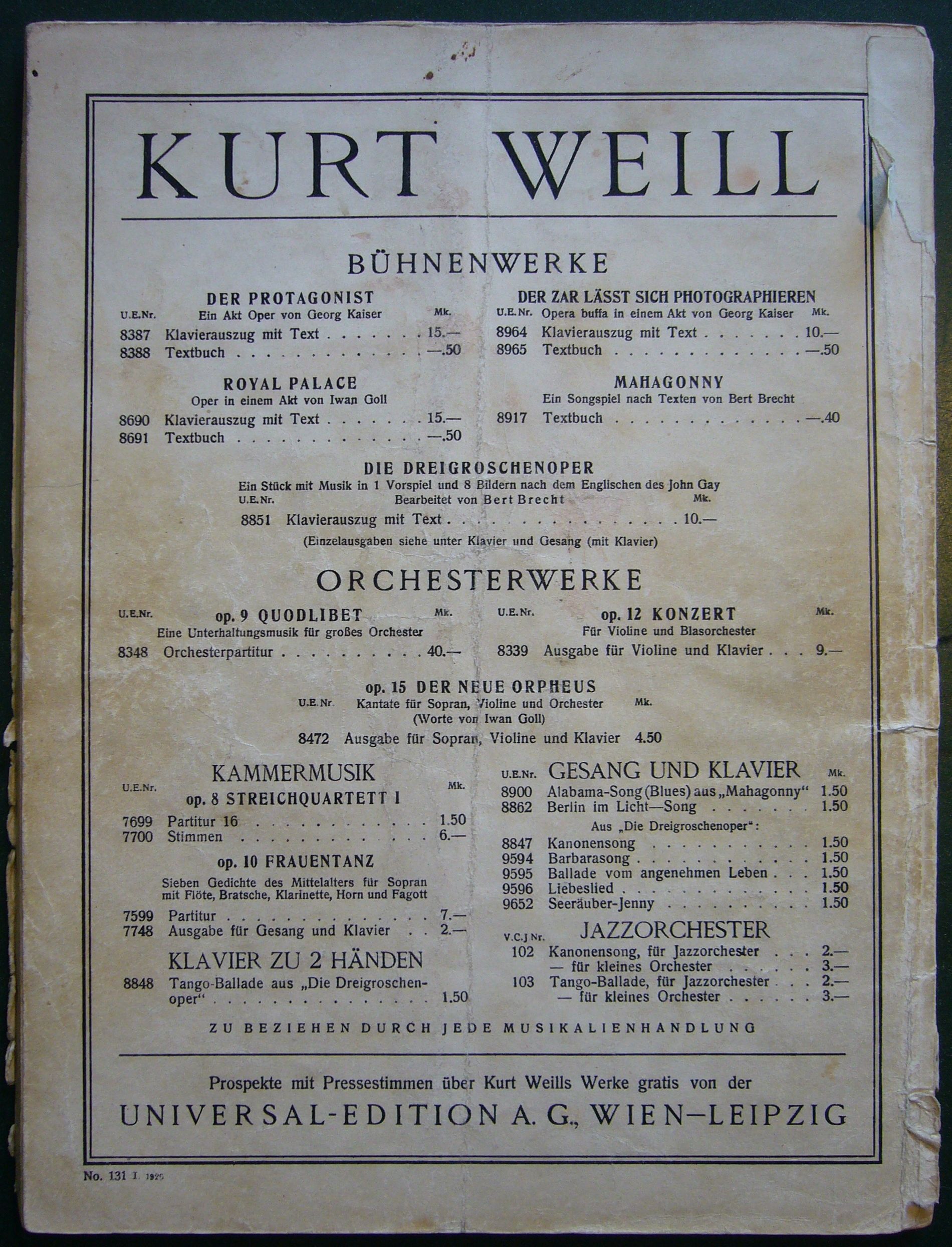 back cover: Light green paper. Recto blank. Verso a green double-lined border. Within the border advertising for other UE publications. For an exact presentation please check the photo below, the most important information is which works and editions are offered: "KURT WEILL / BÜHNENWERKE / DER PROTAGONIST [with UE 8387 and 8388] / DER ZAR LÄSST SICH PHOTOGRAPHIEREN [with UE 8964 and 8965] / ROYAL PALACE [with UE 8690 and 8691] / MAHAGONNY [with UE 8917] / DIE DREIGROSCHENOPER [with UE 8851] / ORCHESTERWERKE / op.9 QUODLIBET [with UE 8348] / op.12 KONZERT [with UE 8339] / KAMMERMUSIK / op.8 STREICHQUARTETT I [with UE 7699 and 7700] / KLAVIER ZU 2 HÄNDEN [with UE 8848] / op.10 FRAUENTANZ [with UE 7599 and 7748] / GESANG UND KLAVIER [with UE 8900, 8847 and 8862] / ZU BEZIEHEN DURCH JEDE MUSIKALIENHANDLUNG / Prospekte mit Pressestimmen über Kurt Weills Werke gratis von der / UNIVERSAL-EDITION A. G., WIEN-LEIPZIG". At the bottom left, outside the border "No. 131 X. 1928."
