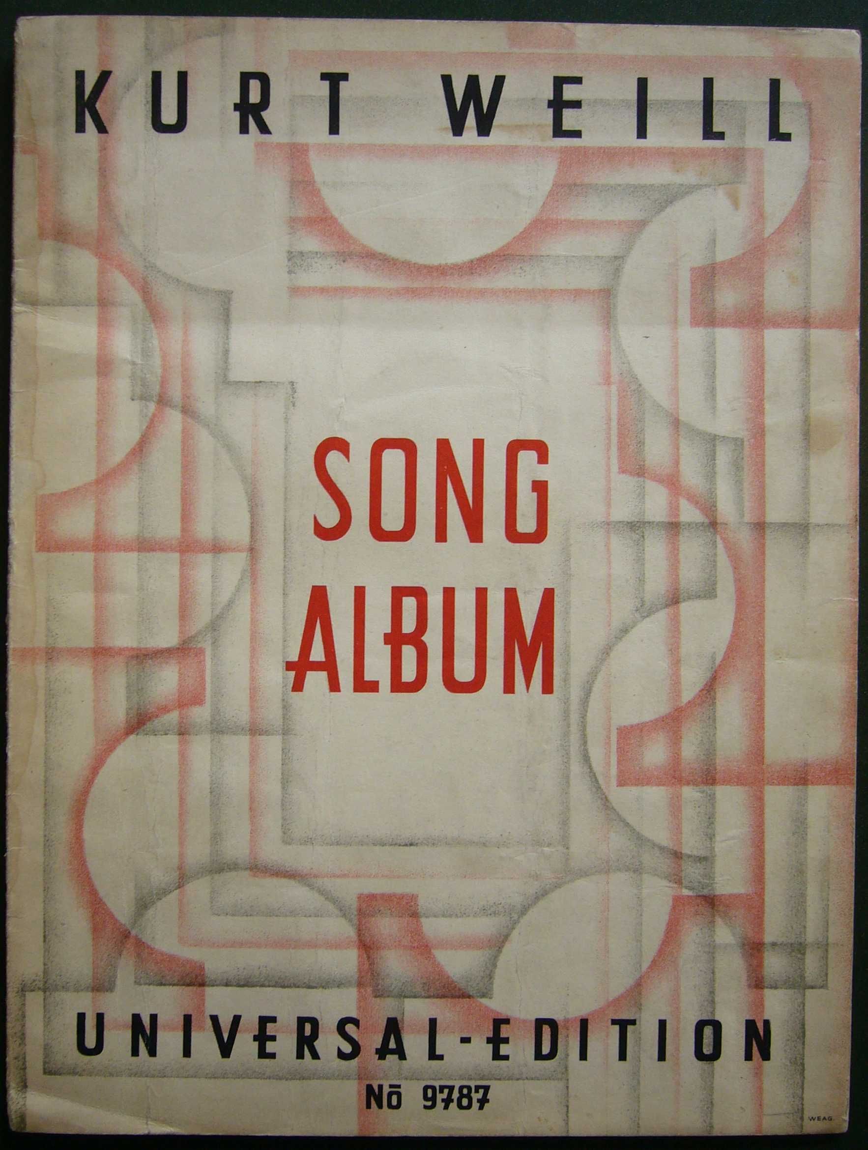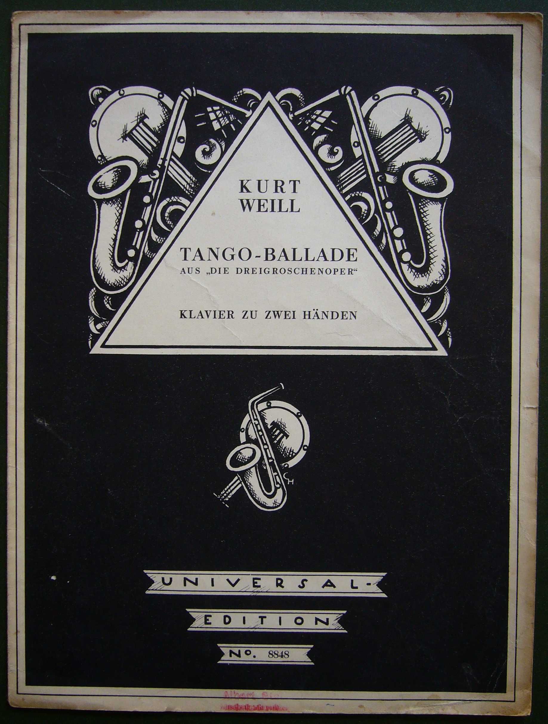 The creation of this back cover plate can be dated quite exactly, because it was also used as the back cover for the publications of the individual songs from the Dreigroschenoper. The copy of the "Tango-Ballade" (UE 8848) printed in the first days of September 1928 still has a back cover with general piano music advertisement, the second edition of the "Kanonen-Song" printed on the last days of November has the new "all Kurt Weill" back cover.