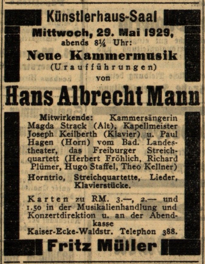 At least in his early years Hans Mann was an active composer. In 1929 a whole concert in Karlsruhe was dedicated to his compositions and received good reviews. Below is the announcement at the Badischer Beobachter from 26 May 1929: